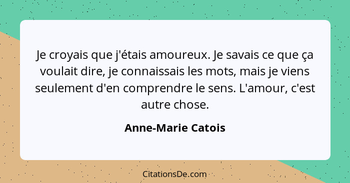 Je croyais que j'étais amoureux. Je savais ce que ça voulait dire, je connaissais les mots, mais je viens seulement d'en comprendre le sens. L'amour, c'est autre chose.