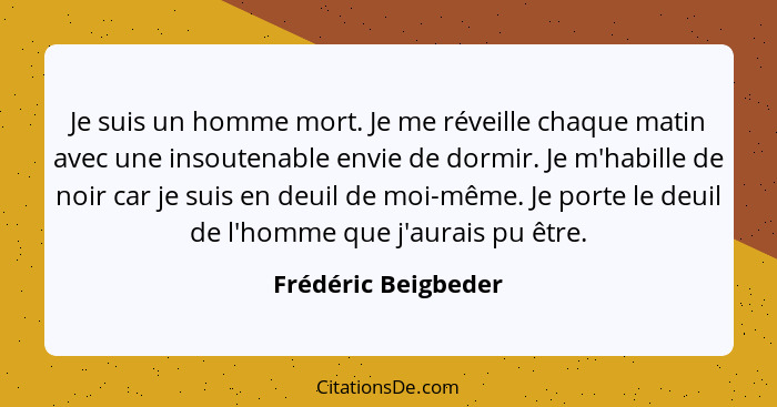 Je suis un homme mort. Je me réveille chaque matin avec une insoutenable envie de dormir. Je m'habille de noir car je suis en deuil de moi-même. Je porte le deuil de l'homme que j'aurais pu être.