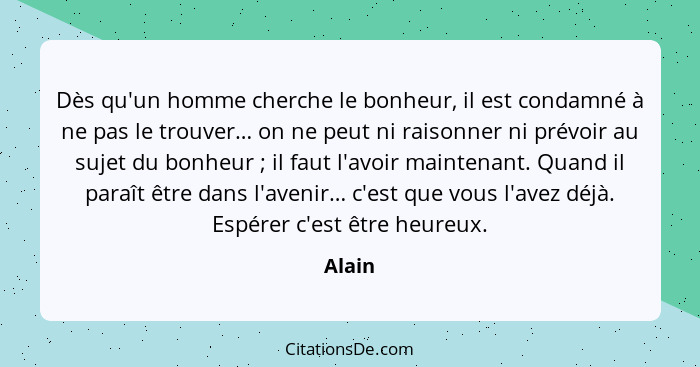 Dès qu'un homme cherche le bonheur, il est condamné à ne pas le trouver… on ne peut ni raisonner ni prévoir au sujet du bonheur ; il faut l'avoir maintenant. Quand il paraît être dans l'avenir… c'est que vous l'avez déjà. Espérer c'est être heureux.