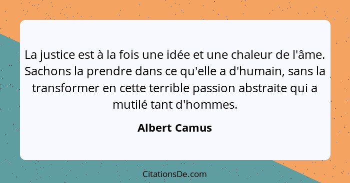 La justice est à la fois une idée et une chaleur de l'âme. Sachons la prendre dans ce qu'elle a d'humain, sans la transformer en cette terrible passion abstraite qui a mutilé tant d'hommes.