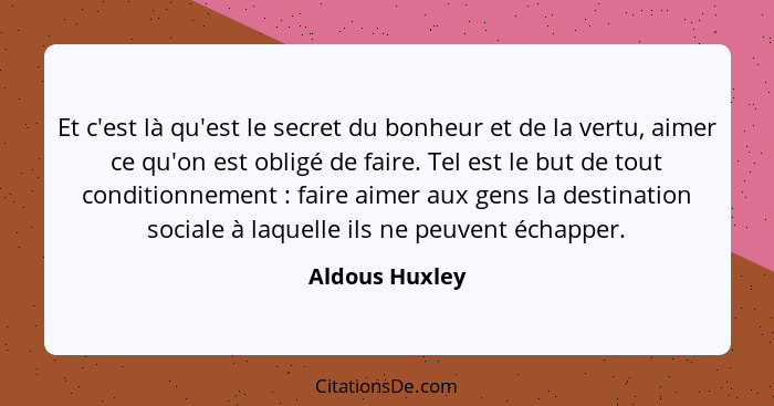 Et c'est là qu'est le secret du bonheur et de la vertu, aimer ce qu'on est obligé de faire. Tel est le but de tout conditionnement : faire aimer aux gens la destination sociale à laquelle ils ne peuvent échapper.