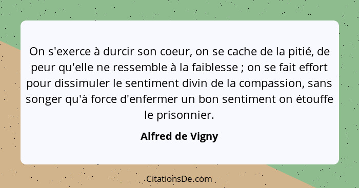 On s'exerce à durcir son coeur, on se cache de la pitié, de peur qu'elle ne ressemble à la faiblesse ; on se fait effort pour dissimuler le sentiment divin de la compassion, sans songer qu'à force d'enfermer un bon sentiment on étouffe le prisonnier.