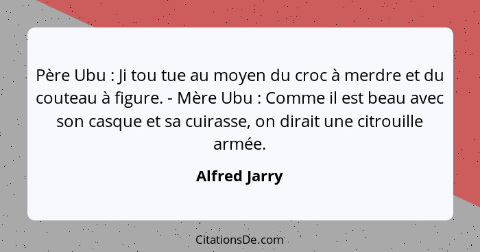 Père Ubu : Ji tou tue au moyen du croc à merdre et du couteau à figure. - Mère Ubu : Comme il est beau avec son casque et sa cuirasse, on dirait une citrouille armée.