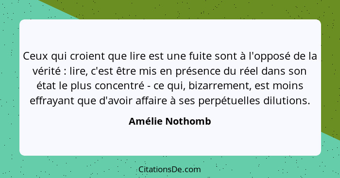 Ceux qui croient que lire est une fuite sont à l'opposé de la vérité : lire, c'est être mis en présence du réel dans son état le plus concentré - ce qui, bizarrement, est moins effrayant que d'avoir affaire à ses perpétuelles dilutions.