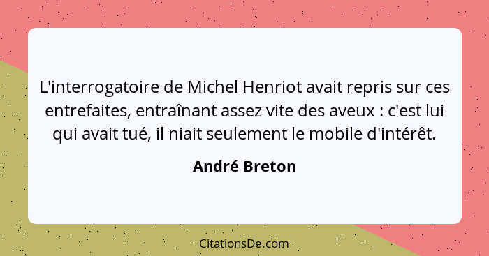 L'interrogatoire de Michel Henriot avait repris sur ces entrefaites, entraînant assez vite des aveux : c'est lui qui avait tué, il niait seulement le mobile d'intérêt.