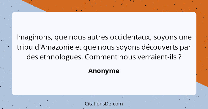 Imaginons, que nous autres occidentaux, soyons une tribu d'Amazonie et que nous soyons découverts par des ethnologues. Comment nous verraient-ils ?