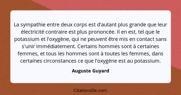 La sympathie entre deux corps est d'autant plus grande que leur électricité contraire est plus prononcée. Il en est, tel que le potassium et l'oxygène, qui ne peuvent être mis en contact sans s'unir immédiatement. Certains hommes sont à certaines femmes, et tous les hommes sont à toutes les femmes, dans certaines circonstances ce que l'oxygène est au potassium.