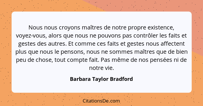 Nous nous croyons maîtres de notre propre existence, voyez-vous, alors que nous ne pouvons pas contrôler les faits et gestes des autres. Et comme ces faits et gestes nous affectent plus que nous le pensons, nous ne sommes maîtres que de bien peu de chose, tout compte fait. Pas même de nos pensées ni de notre vie.
