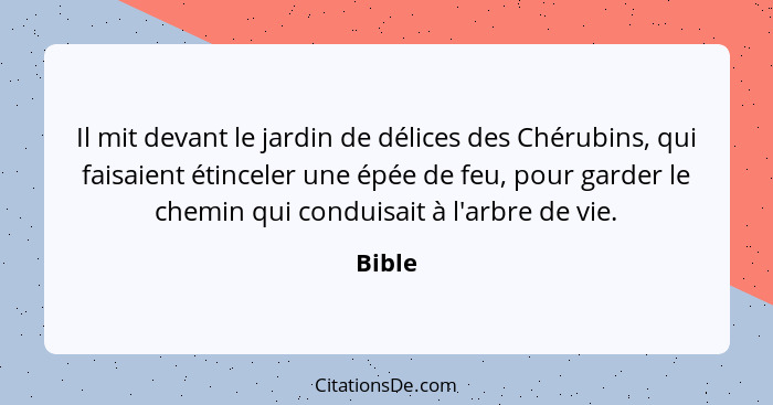 Il mit devant le jardin de délices des Chérubins, qui faisaient étinceler une épée de feu, pour garder le chemin qui conduisait à l'arbre de vie.