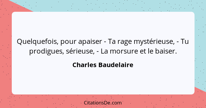 Quelquefois, pour apaiser - Ta rage mystérieuse, - Tu prodigues, sérieuse, - La morsure et le baiser.