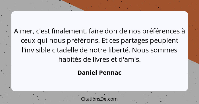 Aimer, c'est finalement, faire don de nos préférences à ceux qui nous préférons. Et ces partages peuplent l'invisible citadelle de notre liberté. Nous sommes habités de livres et d'amis.