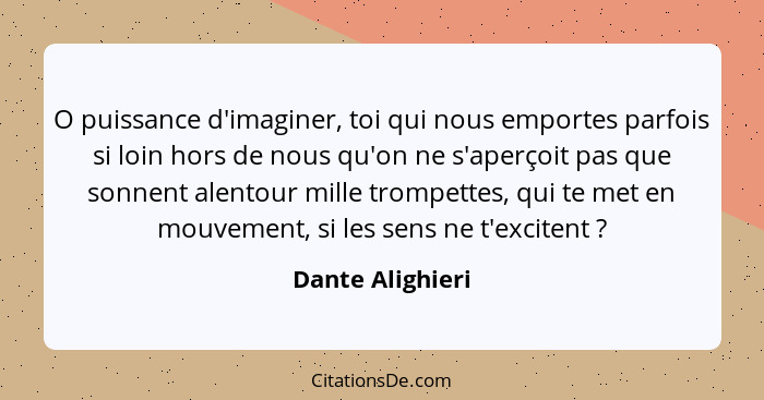 O puissance d'imaginer, toi qui nous emportes parfois si loin hors de nous qu'on ne s'aperçoit pas que sonnent alentour mille trompettes, qui te met en mouvement, si les sens ne t'excitent ?