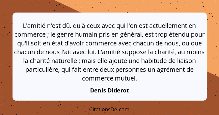 L'amitié n'est dû. qu'à ceux avec qui l'on est actuellement en commerce ; le genre humain pris en général, est trop étendu pour qu'il soit en état d'avoir commerce avec chacun de nous, ou que chacun de nous l'ait avec lui. L'amitié suppose la charité, au moins la charité naturelle ; mais elle ajoute une habitude de liaison particulière, qui fait entre deux personnes un agrément de commerce mutuel.