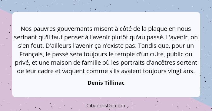 Nos pauvres gouvernants misent à côté de la plaque en nous serinant qu'il faut penser à l'avenir plutôt qu'au passé. L'avenir, on s'en fout. D'ailleurs l'avenir ça n'existe pas. Tandis que, pour un Français, le passé sera toujours le temple d'un culte, public ou privé, et une maison de famille où les portraits d'ancêtres sortent de leur cadre et vaquent comme s'ils avaient toujours vingt ans.