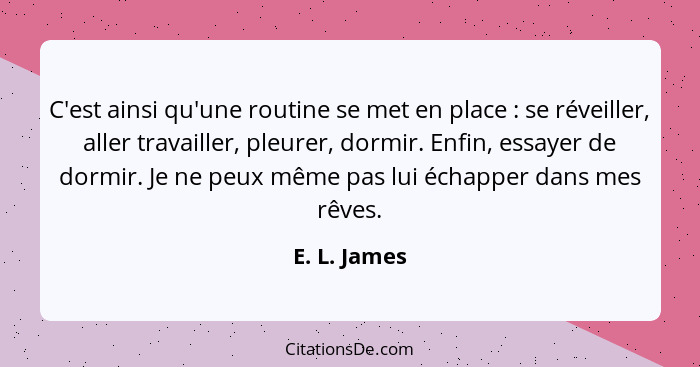 C'est ainsi qu'une routine se met en place : se réveiller, aller travailler, pleurer, dormir. Enfin, essayer de dormir. Je ne peux même pas lui échapper dans mes rêves.