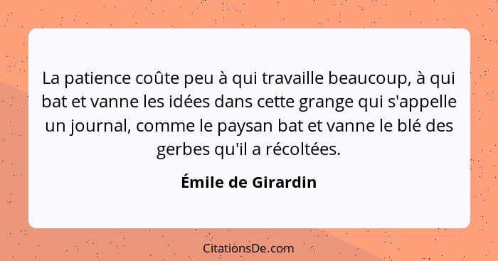 La patience coûte peu à qui travaille beaucoup, à qui bat et vanne les idées dans cette grange qui s'appelle un journal, comme le paysan bat et vanne le blé des gerbes qu'il a récoltées.