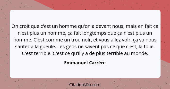 On croit que c'est un homme qu'on a devant nous, mais en fait ça n'est plus un homme, ça fait longtemps que ça n'est plus un homme. C'est comme un trou noir, et vous allez voir, ça va nous sautez à la gueule. Les gens ne savent pas ce que c'est, la folie. C'est terrible. C'est ce qu'il y a de plus terrible au monde.