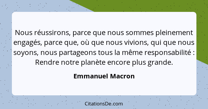 Nous réussirons, parce que nous sommes pleinement engagés, parce que, où que nous vivions, qui que nous soyons, nous partageons tous la même responsabilité : Rendre notre planète encore plus grande.