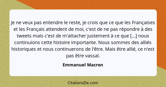 Je ne veux pas entendre le reste, je crois que ce que les Françaises et les Français attendent de moi, c'est de ne pas répondre à des tweets mais c'est de m'attacher justement à ce que [...] nous continuions cette histoire importante. Nous sommes des alliés historiques et nous continuerons de l'être. Mais être allié, ce n'est pas être vassal.