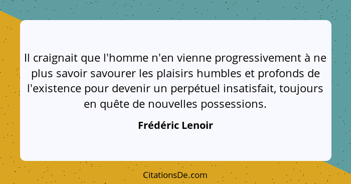 Il craignait que l'homme n'en vienne progressivement à ne plus savoir savourer les plaisirs humbles et profonds de l'existence pour devenir un perpétuel insatisfait, toujours en quête de nouvelles possessions.