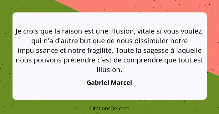Je crois que la raison est une illusion, vitale si vous voulez, qui n'a d'autre but que de nous dissimuler notre impuissance et notre fragilité. Toute la sagesse à laquelle nous pouvons prétendre c'est de comprendre que tout est illusion.