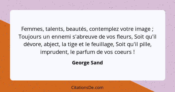 Femmes, talents, beautés, contemplez votre image ; Toujours un ennemi s'abreuve de vos fleurs, Soit qu'il dévore, abject, la tige et le feuillage, Soit qu'il pille, imprudent, le parfum de vos coeurs !