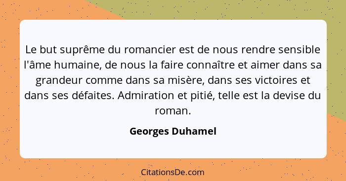 Le but suprême du romancier est de nous rendre sensible l'âme humaine, de nous la faire connaître et aimer dans sa grandeur comme dans sa misère, dans ses victoires et dans ses défaites. Admiration et pitié, telle est la devise du roman.