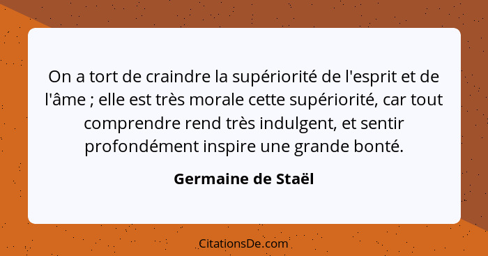 On a tort de craindre la supériorité de l'esprit et de l'âme ; elle est très morale cette supériorité, car tout comprendre rend très indulgent, et sentir profondément inspire une grande bonté.