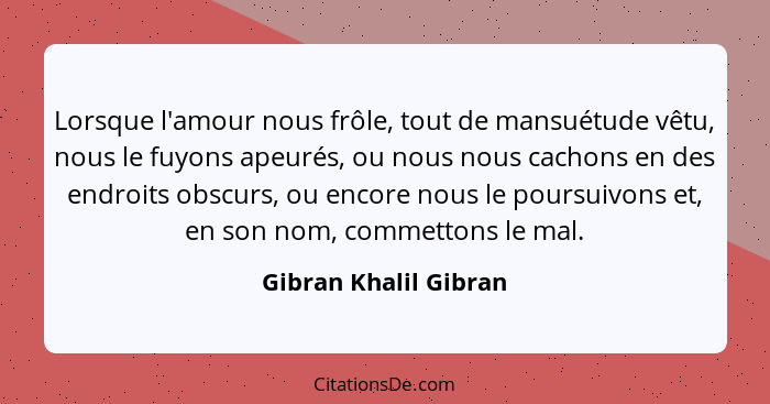 Lorsque l'amour nous frôle, tout de mansuétude vêtu, nous le fuyons apeurés, ou nous nous cachons en des endroits obscurs, ou encore nous le poursuivons et, en son nom, commettons le mal.