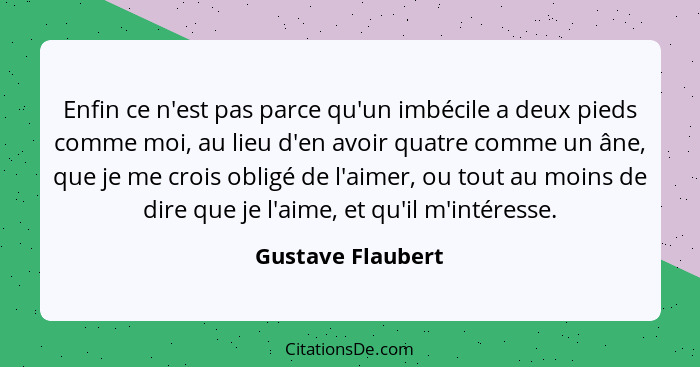 Enfin ce n'est pas parce qu'un imbécile a deux pieds comme moi, au lieu d'en avoir quatre comme un âne, que je me crois obligé de l'aimer, ou tout au moins de dire que je l'aime, et qu'il m'intéresse.