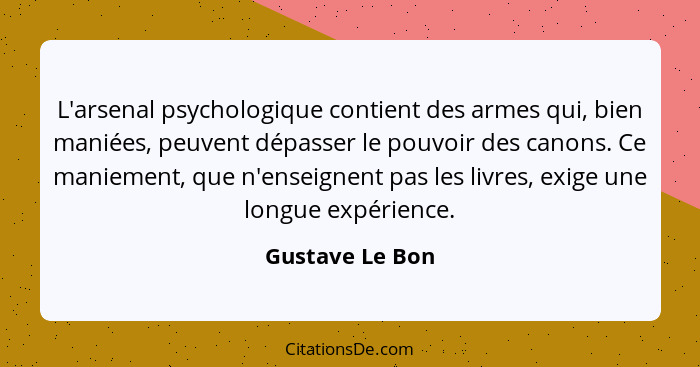 L'arsenal psychologique contient des armes qui, bien maniées, peuvent dépasser le pouvoir des canons. Ce maniement, que n'enseignent pas les livres, exige une longue expérience.
