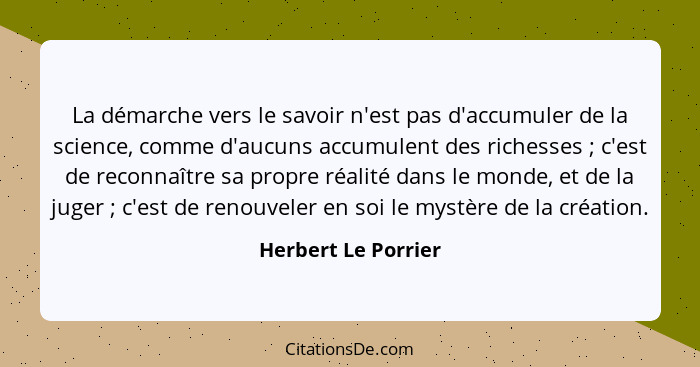 La démarche vers le savoir n'est pas d'accumuler de la science, comme d'aucuns accumulent des richesses ; c'est de reconnaître sa propre réalité dans le monde, et de la juger ; c'est de renouveler en soi le mystère de la création.