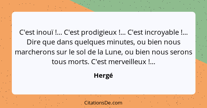 C'est inouï !... C'est prodigieux !... C'est incroyable !... Dire que dans quelques minutes, ou bien nous marcherons sur le sol de la Lune, ou bien nous serons tous morts. C'est merveilleux !...