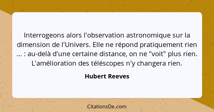 Interrogeons alors l'observation astronomique sur la dimension de l'Univers. Elle ne répond pratiquement rien ... : au-delà d'une certaine distance, on ne "voit" plus rien. L'amélioration des téléscopes n'y changera rien.