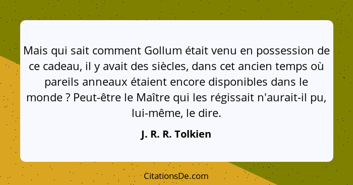 Mais qui sait comment Gollum était venu en possession de ce cadeau, il y avait des siècles, dans cet ancien temps où pareils anneaux étaient encore disponibles dans le monde ? Peut-être le Maître qui les régissait n'aurait-il pu, lui-même, le dire.
