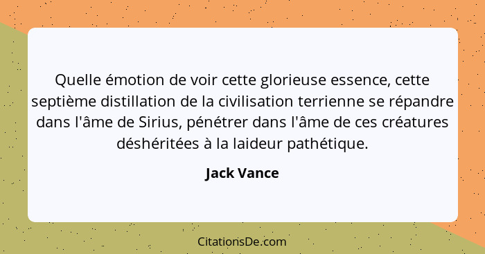 Quelle émotion de voir cette glorieuse essence, cette septième distillation de la civilisation terrienne se répandre dans l'âme de Sirius, pénétrer dans l'âme de ces créatures déshéritées à la laideur pathétique.