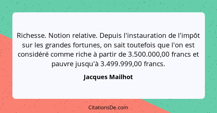Richesse. Notion relative. Depuis l'instauration de l'impôt sur les grandes fortunes, on sait toutefois que l'on est considéré comme riche à partir de 3.500.000,00 francs et pauvre jusqu'à 3.499.999,00 francs.