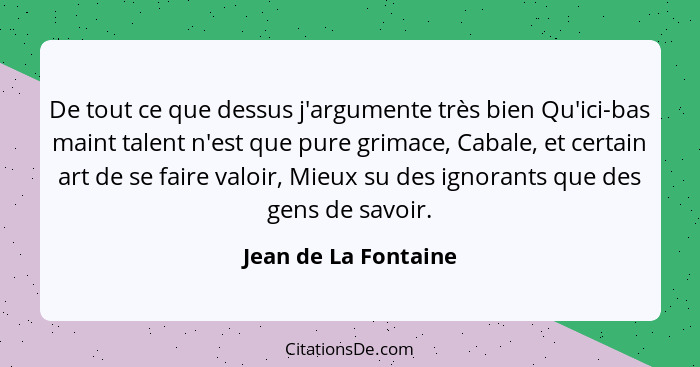 De tout ce que dessus j'argumente très bien Qu'ici-bas maint talent n'est que pure grimace, Cabale, et certain art de se faire valoir, Mieux su des ignorants que des gens de savoir.