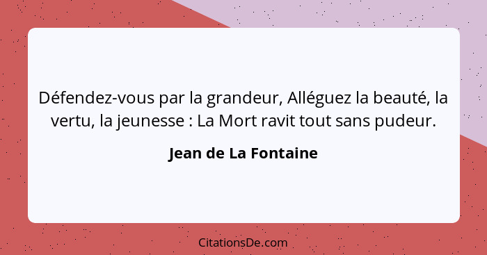 Défendez-vous par la grandeur, Alléguez la beauté, la vertu, la jeunesse : La Mort ravit tout sans pudeur.