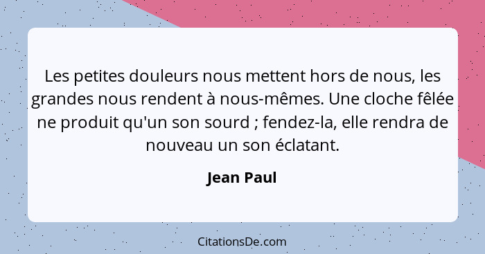 Les petites douleurs nous mettent hors de nous, les grandes nous rendent à nous-mêmes. Une cloche fêlée ne produit qu'un son sourd ; fendez-la, elle rendra de nouveau un son éclatant.