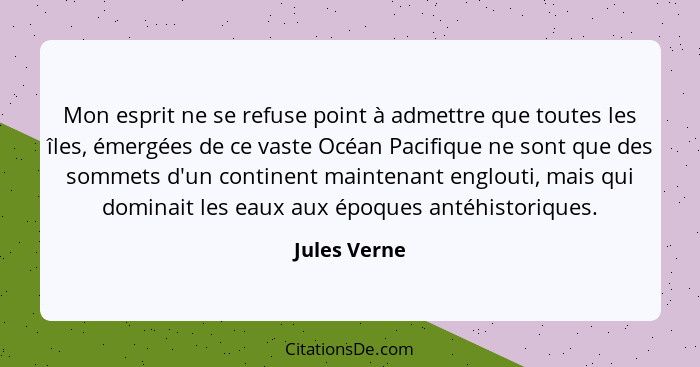 Mon esprit ne se refuse point à admettre que toutes les îles, émergées de ce vaste Océan Pacifique ne sont que des sommets d'un continent maintenant englouti, mais qui dominait les eaux aux époques antéhistoriques.