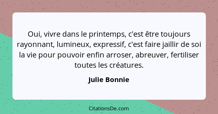 Oui, vivre dans le printemps, c'est être toujours rayonnant, lumineux, expressif, c'est faire jaillir de soi la vie pour pouvoir enfin arroser, abreuver, fertiliser toutes les créatures.