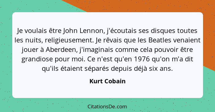 Je voulais être John Lennon, j'écoutais ses disques toutes les nuits, religieusement. Je rêvais que les Beatles venaient jouer à Aberdeen, j'imaginais comme cela pouvoir être grandiose pour moi. Ce n'est qu'en 1976 qu'on m'a dit qu'ils étaient séparés depuis déjà six ans.