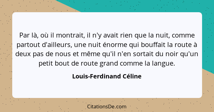 Par là, où il montrait, il n'y avait rien que la nuit, comme partout d'ailleurs, une nuit énorme qui bouffait la route à deux pas de nous et même qu'il n'en sortait du noir qu'un petit bout de route grand comme la langue.