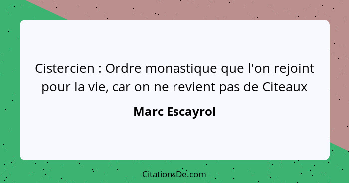 Cistercien : Ordre monastique que l'on rejoint pour la vie, car on ne revient pas de Citeaux