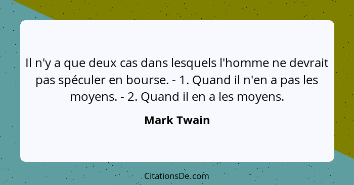 Il n'y a que deux cas dans lesquels l'homme ne devrait pas spéculer en bourse. - 1. Quand il n'en a pas les moyens. - 2. Quand il en a les moyens.