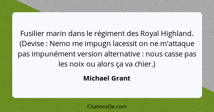 Fusilier marin dans le régiment des Royal Highland. (Devise : Nemo me impugn lacessit on ne m'attaque pas impunément version alternative : nous casse pas les noix ou alors ça va chier.)