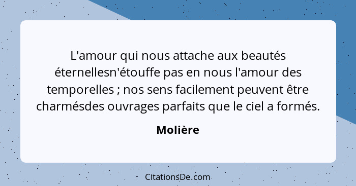L'amour qui nous attache aux beautés éternellesn'étouffe pas en nous l'amour des temporelles ; nos sens facilement peuvent être charmésdes ouvrages parfaits que le ciel a formés.