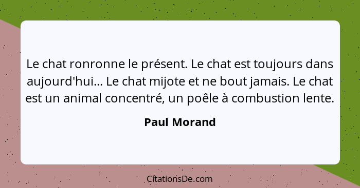 Le chat ronronne le présent. Le chat est toujours dans aujourd'hui... Le chat mijote et ne bout jamais. Le chat est un animal concentré, un poêle à combustion lente.