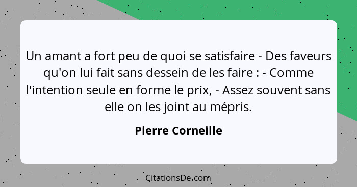 Un amant a fort peu de quoi se satisfaire - Des faveurs qu'on lui fait sans dessein de les faire : - Comme l'intention seule en forme le prix, - Assez souvent sans elle on les joint au mépris.
